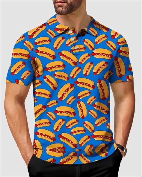 The Hot Dog Golf Polo features an all-over print of hot dogs, mustard, and ketchup. The shirt is made from a lightweight, breathable fabric that is perfect for hot summer days on the golf course. The shirt also has a classic polo collar and three-button placket.